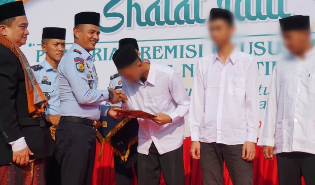 KORANJURI.COM – Usai menjalankan ibadah sholat Ied sejumlah Warga Binaan Pemasyarakatan (WBP) Lapas Narkotika Jakarta, mengikuti upacara pemberian remisi di Lapangan Lapas Narkotika Jakarta, Sabtu, 22 April 2023.