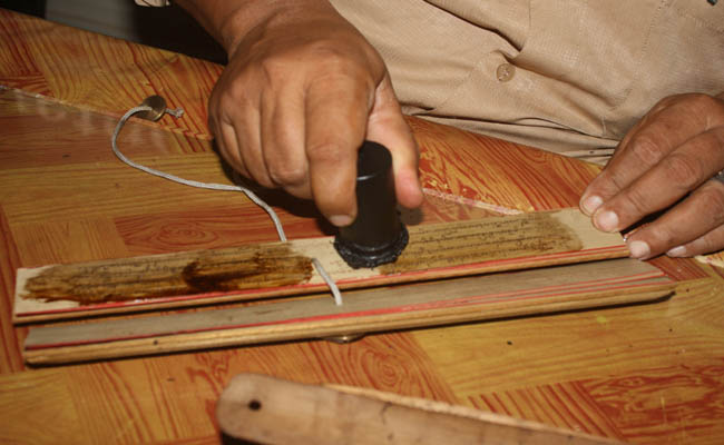 Pelumuran dengan minyak kemiri. Ekstrak kemiri berfungsi untuk mempertajam guratan aksara yang sudah memudar – foto: Koranjuri.com